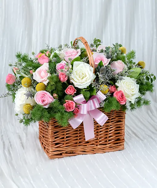 กระเช้าดอกไม้จัดแต่งในโทนสีสันอ่อนหวาน ประกอบไปด้วยดอกกุหลาบสีชมพู 10 ดอก ดอกกุหลาบสีขาว 8 ดอก แซมสีเขียวสดใสด้วยใบปริก, เม็ดกระดุมทอง, ยูคาลิปตัสใบกลม, ฮิลิเจียม, และแคสเปีย จัดตกแต่งเข้าด้วยกันอย่างลงตัวจนออกมาเป็นกระเช้าดอกไม้ที่เปี่ยมไปด้วยความปรารถนาจากผู้ให้ถึงผู้รับ เหมาะสำหรับแสดงความยินดีในโอกาสต่าง ๆ โดยเฉพาะมอบให้ผู้ใหญ่ที่เราเคารพรักเนื่องจากเกษียณงาน หรือเลื่อนตำแหน่ง